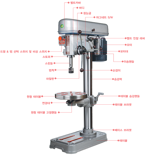 철재, 목재, 기타 공작물의 구멍을 뚫는데 사용하는 고정밀도 장비입니다.