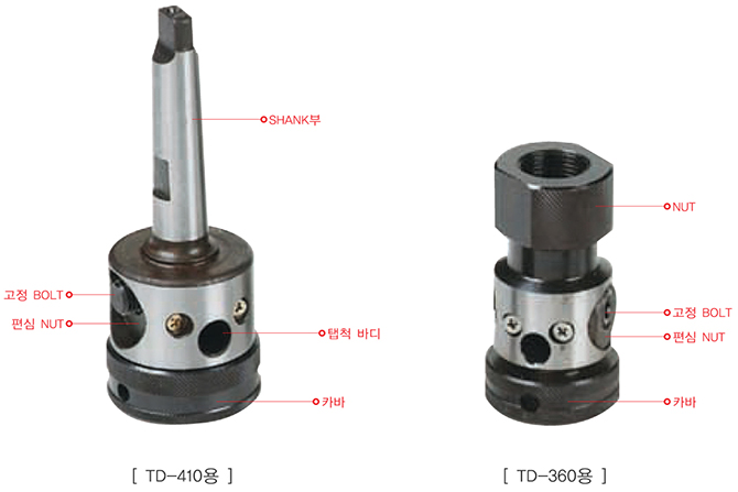 탭척의 분리는 클램프 너트 위 나사를 푸는 방향으로 돌리면 척을 풀립니다.